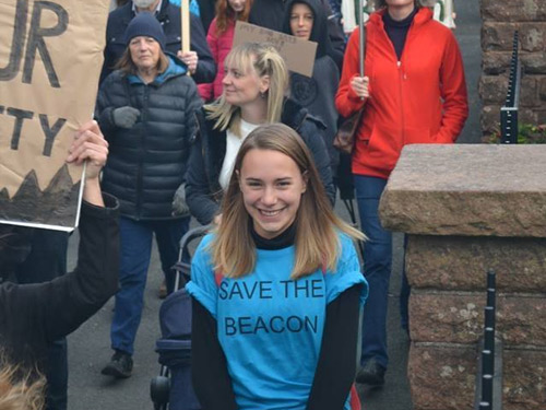 We only had just over a week to arrange a rally, yet such was the public support we achieved this. Several hundred people of all ages attended. People marched from all parts of the town and congregated in the centre to support our cause. Various people spoke, including a local teenager who emphasised the importance of the forest for young people and our climate. A young man had even written a song to celebrate the Beacon. We were on BBC and ITV local news that night.